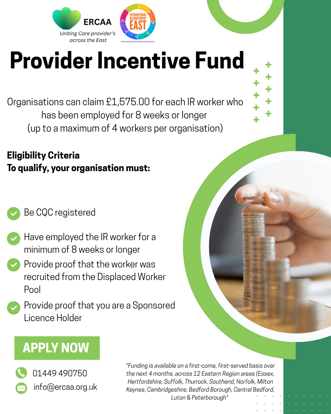 The East of England Regional Care Association (ERCAA), in collaboration with International Recruitment England (IRE), is pleased to announce the establishment of a Provider Incentive Fund.